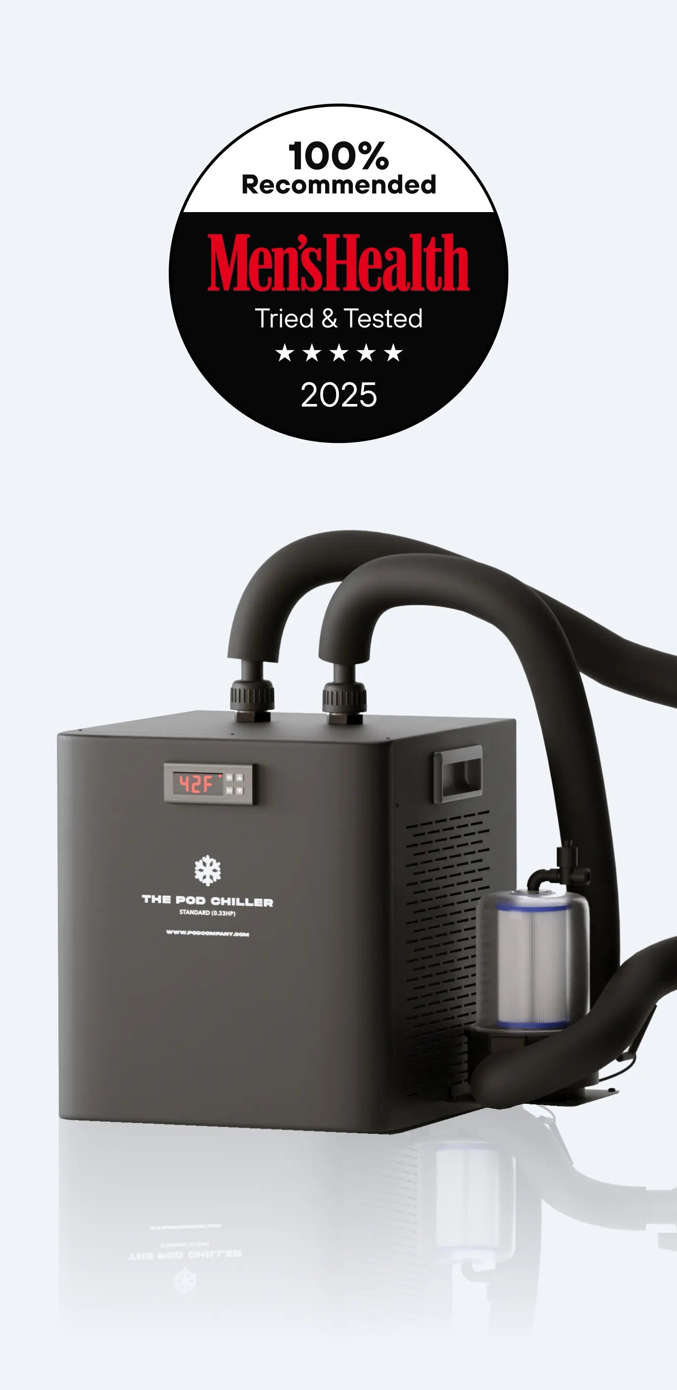 The ultimate solution for your ice bath routine. The Pod Chiller brings your water down to a refreshing 39°F (3°C) in no time, built-in water filtration keeps your water clean for 4+ weeks. No need for ice cubes ever again. Suitable for indoors + outdoors. Only 280W power usage, the same as the freezer in your home.